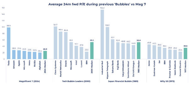 L’analyse des ratios cours/bénéfices (P/E) montre que les valorisations des « Magnificent 7 » restent bien inférieures à celles des bulles passées. Le P/E médian à 24 mois est de 25,9x, contre 53,2x pour la bulle tech de 2000. Malgré l’exposition du Guinness Global Innovators Fund à l’IA, celle-ci n’a pas augmenté récemment, illustrant une approche équilibrée et diversifiée.