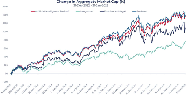 Des coûts de formation plus faibles et des modèles plus efficaces pourraient accélérer le passage de la formation à l'inférence, un processus déjà en cours. L'inférence est largement considérée comme ayant un marché total accessible beaucoup plus important à long terme, car elle comprend une gamme plus large de cas d'utilisation. Cela concerne par exemple la pose de questions simples à un LLM ou la capacité donnée aux véhicules autonomes de traiter les données en temps réel. Les LLM moins gourmands en énergie pourront fonctionner sur un plus grand nombre d'appareils dits « périphériques » (appareils qui traitent les données près de la source, comme les téléphones, les voitures ou les accessoires portables) et faciliteront le passage à l'inférence. En conséquence, nous pourrions assister à un déplacement de la création de valeur des « facilitateurs d'IA » (ceux qui fournissent l'infrastructure fondamentale de l'IA) vers les « intégrateurs d'IA » (ceux qui fournissent des logiciels, des applications et des services construits au-dessus de cette infrastructure). Le graphique ci-dessus montre les performances de ces deux groupes en janvier et, en particulier, la forte divergence après l'annonce de DeepSeek. Si la réaction initiale du marché suggère que les intégrateurs pourraient bénéficier de modèles moins coûteux et plus efficaces, il est clair qu'il existe encore un large éventail d'opportunités à de nombreux stades de la chaîne de valeur de l'IA.
