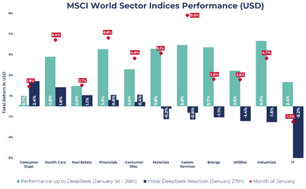 Le graphique ci-dessus montre les performances du MSCI World de janvier à l'annonce de DeepSeek (en vert), la réaction du marché le jour de la publication du modèle R1 (en bleu) et les performances de janvier (en rouge). Comme le montre le graphique, les actions ont généralement bien performé jusqu'à la publication du modèle DeepSeek R1 en janvier, enregistrant des gains généralisés et des rendements positifs dans tous les secteurs. Cependant, à l'annonce de DeepSeek, les performances ont été beaucoup plus variées. Les secteurs tels que l'informatique, l'industrie, les services publics et l'énergie, qui comprennent de nombreux facilitateurs de l'IA, ont été les plus touchés, les investisseurs ayant évalué les implications de la baisse des coûts de formation sur les entreprises impliquées dans la construction de centres de données.