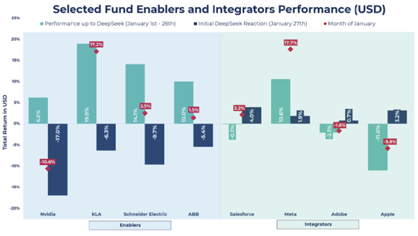 Contrairement aux facilitateurs, les intégrateurs d’IA ont réagi positivement à l’annonce de DeepSeek. Salesforce (+4 %), Meta (+1,9 %), Adobe (+0,7 %) et Apple (+3,2 %) ont bénéficié des perspectives d'une IA plus accessible, favorisant la valeur ajoutée des solutions intégrées. Meta, bien qu’investissant massivement dans l’IA, est considérée comme un intégrateur, utilisant l’IA pour renforcer ses services et générer des revenus publicitaires.