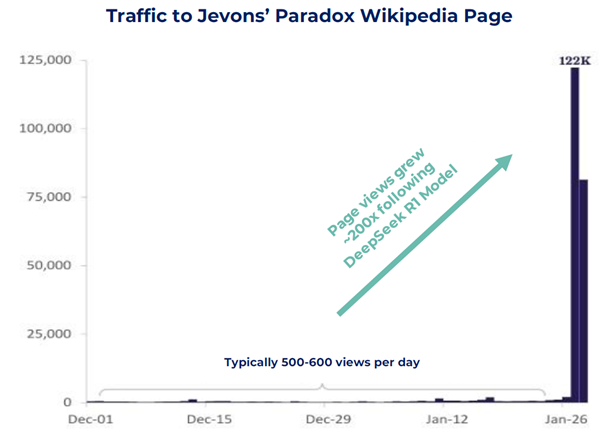 Les implications à long terme du modèle DeepSeek sont loin d'être certaines et, compte tenu du rythme des développements de l'IA, elles se manifesteront probablement de manière imprévisible. Cela a permis aux pessimistes comme aux optimistes de s'appuyer sur les nouvelles concernant DeepSeek pour étayer leurs positions. Pour ceux qui pensaient que le thème de l'intelligence artificielle était surestimé, les nouvelles du marché de janvier ont renforcé leur point de vue. À l'inverse, beaucoup ont cherché à renforcer la thèse haussière en citant le paradoxe de Jevons, selon lequel une efficacité accrue dans l'utilisation des ressources peut conduire à une augmentation de la consommation globale (et non à une réduction), car la baisse des coûts entraînera une augmentation des cas d'utilisation et donc de la demande globale. En ce qui concerne le calcul, l'argument est que des modèles d'IA plus efficaces conduiront à un coût d'utilisation moins élevé, et donc que davantage d'organisations pourront utiliser l'IA (en grande partie par le biais de l'inférence), ce qui conduira à une courbe d'adoption plus abrupte. Depuis l'avènement du microprocesseur, il y a plus de 50 ans, la demande en calcul n'a jamais fait défaut. Des machines plus puissantes (et donc un calcul plus abondant) ont toujours été utilisées pour innover et profiter au consommateur final dans un large éventail de cas d'utilisation. Le graphique ci-dessus montre la popularité croissante du paradoxe de Jevons, et cela pourrait continuer à être vrai.