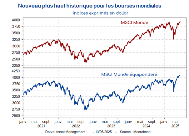 Après le soulagement provoqué par la désescalade commerciale depuis le 10 avril – qui a mené l’indice MSCI Monde en dollars à un nouveau plus haut le 12 juin (graphique 1) – les investisseurs s’interrogent sur la prochaine phase. L’été 2025 s’annonce passionnant avec des risques macroéconomiques à la hausse et à la baisse, en fonction des statistiques américaines – pour le moment rassurantes – et de la prolongation ou non, et à quelles conditions, des négociations commerciales avec l’Amérique de Trump.