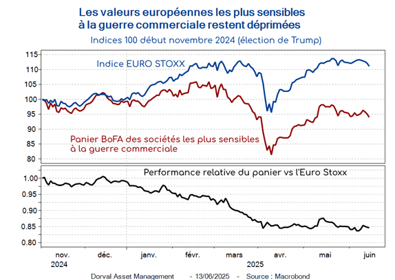 Certes, la perception du risque lié à la guerre commerciale semble s’être estompée, reléguée au second plan par de nombreux investisseurs. Pourtant, ce sujet continue de peser sur certains segments de marché. En Europe, les actions des secteurs les plus exposés aux tensions commerciales — luxe, automobile, consommation, industrie — accusent toujours un net retard (graphique 2). Si d’autres facteurs expliquent aussi leur sous-performance, la guerre commerciale contribue à entretenir une prime de risque substantielle. L’administration Trump, particulièrement agacée par l’inertie tatillonne de la Commission européenne, pourrait en effet renflammer le dossier à tout moment. Inversement, une accalmie perçue comme suffisamment durable redonnerait de l’élan à ces valeurs.
