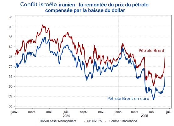 16 juin 2025 - La récente remontée des prix du pétrole, alimentée par les tensions entre Israël et l’Iran, ajoute un nouvel élément d'incertitude aux perspectives économiques estivales. Toutefois, pour l’Europe, cet impact reste modéré, principalement grâce à l’appréciation de l’euro face au dollar, qui atténue la hausse des prix en devise locale.