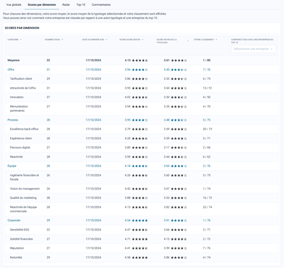 Le scoring offre une analyse fine sur 16 critères, incluant l’offre, les processus, l’équipe et les aspects corporate. Ces données constituent un baromètre précieux mis à jour quotidiennement, permettant à chaque entreprise de suivre son évolution en temps réel.