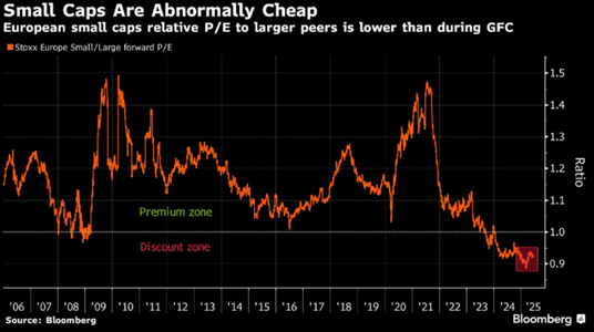 Après plusieurs années de sous-performance, les small caps en Europe sont aujourd’hui nettement décotées par rapport aux grandes capitalisations :