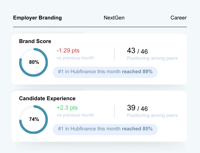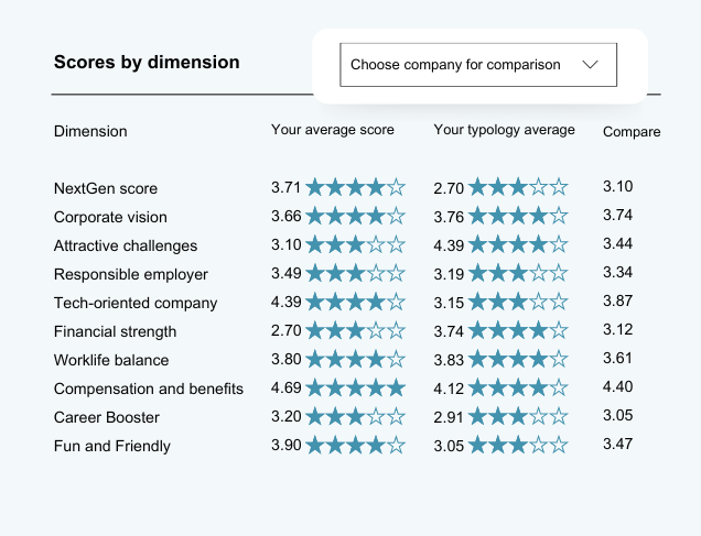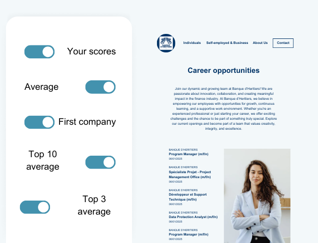 Three sets of data (employee reviews, NextGen and career page) are available, covering more than 30 criteria. Plus, you can always access your rankings to see where you stand and how you're progressing.