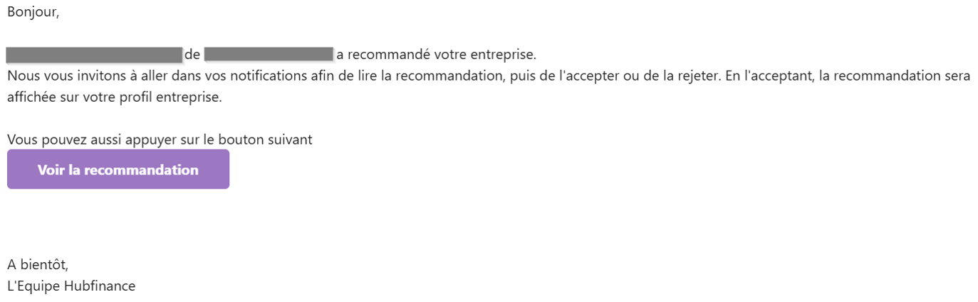 - Vous êtes notifié(e) par email. Une notification apparaît également sur la page "Accueil" et sur votre page de "Notifications". Si un membre recommande votre entreprise, l'administrateur de votre compte recevera les notifications. Pour garantir que vos profils membre et entreprise restent professionnels et pertinents, vous avez le dernier mot sur les recommandations reçues.