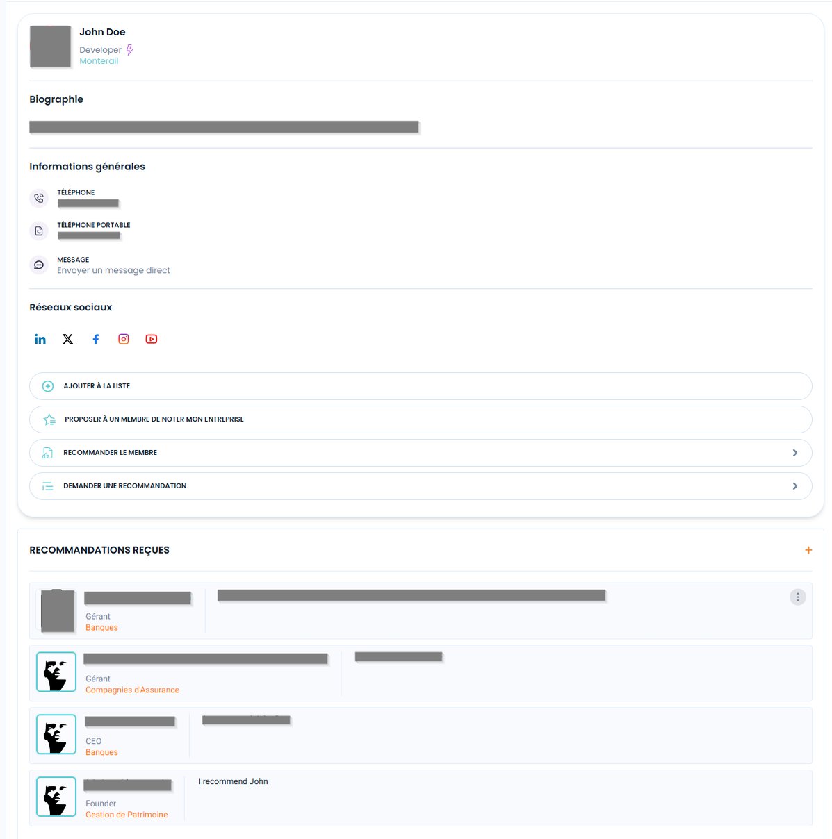 Les profils membres et entreprises : En cliquant sur les boutons "Recommander l'entreprise"
